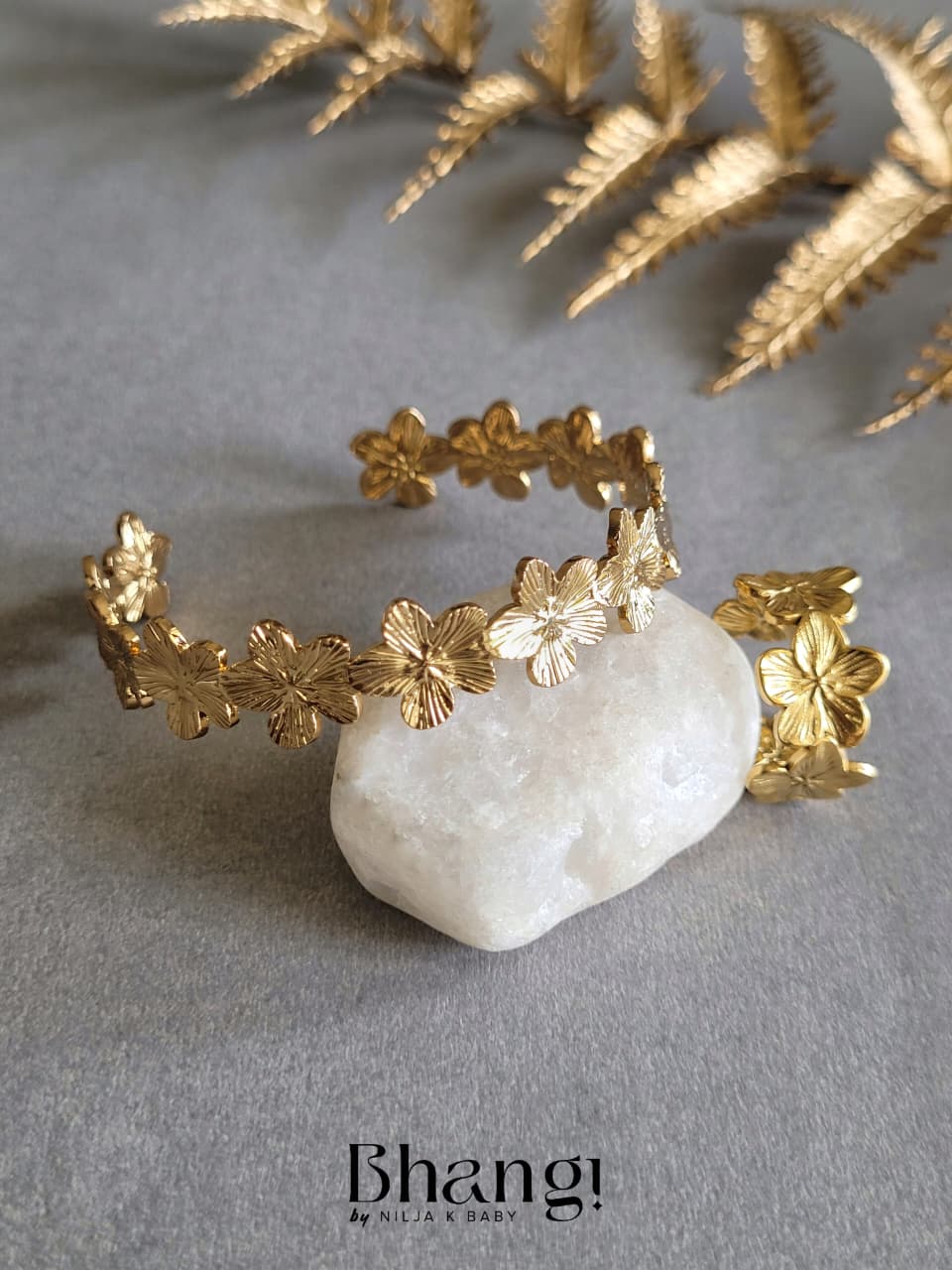 The Bloom Charm Set by Bhangi is a celebration of femininity and timeless grace. Adorned with intricately carved golden florals, this matching ring and bangle set brings the beauty of a spring garden to your wrist and fingertips. With its delicate detailing and radiant finish, it’s the perfect blend of elegance and artistry — made for women who bloom in every season.