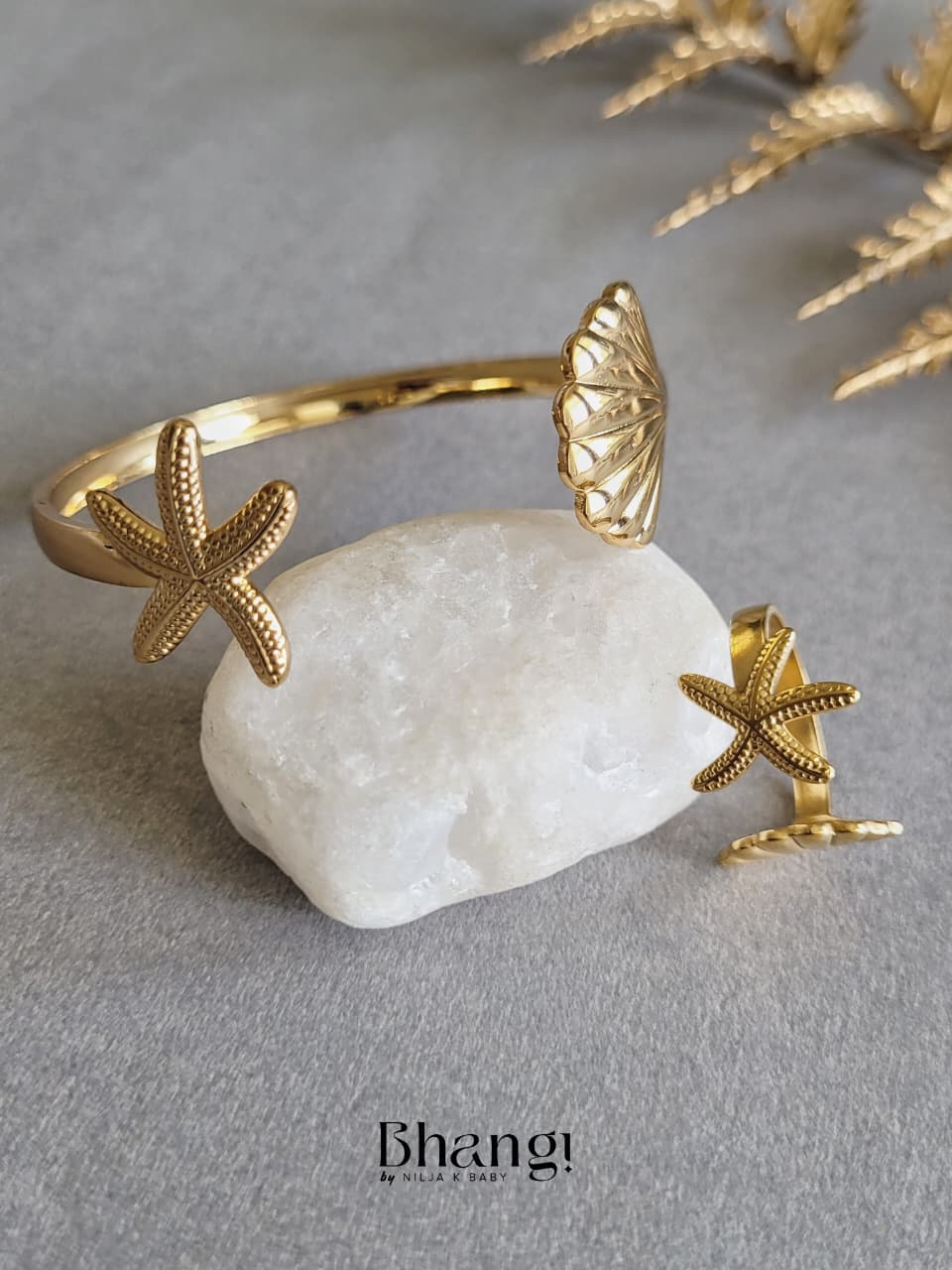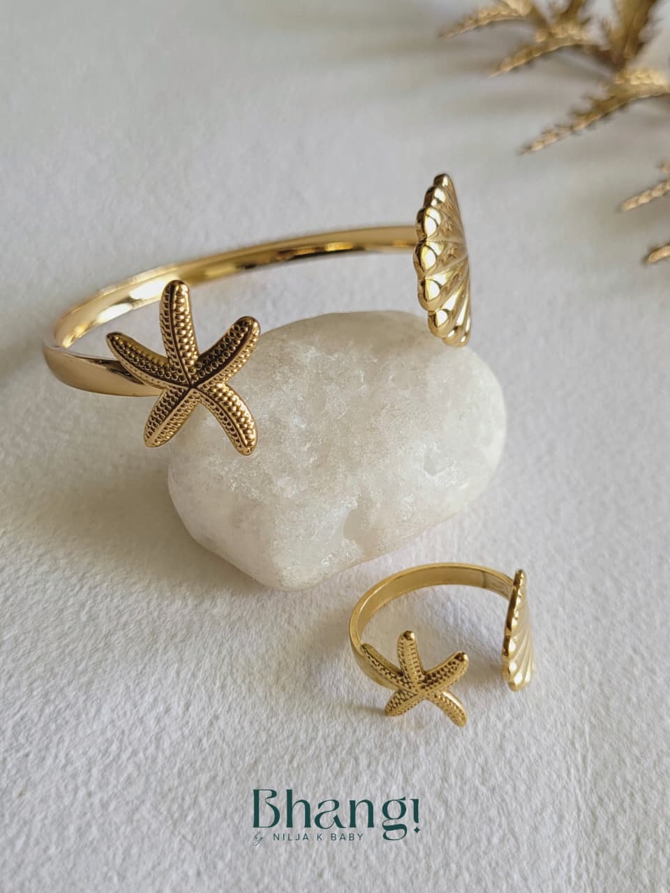 The Sea Whisper Set by Bhangi brings the calm and beauty of the ocean to your everyday look. Featuring a delicately crafted starfish and seashell design, this gold-toned ring and bangle duo captures the essence of coastal charm and effortless elegance. Perfect for beach lovers and free spirits, it’s a reminder to carry a touch of the sea wherever you go.