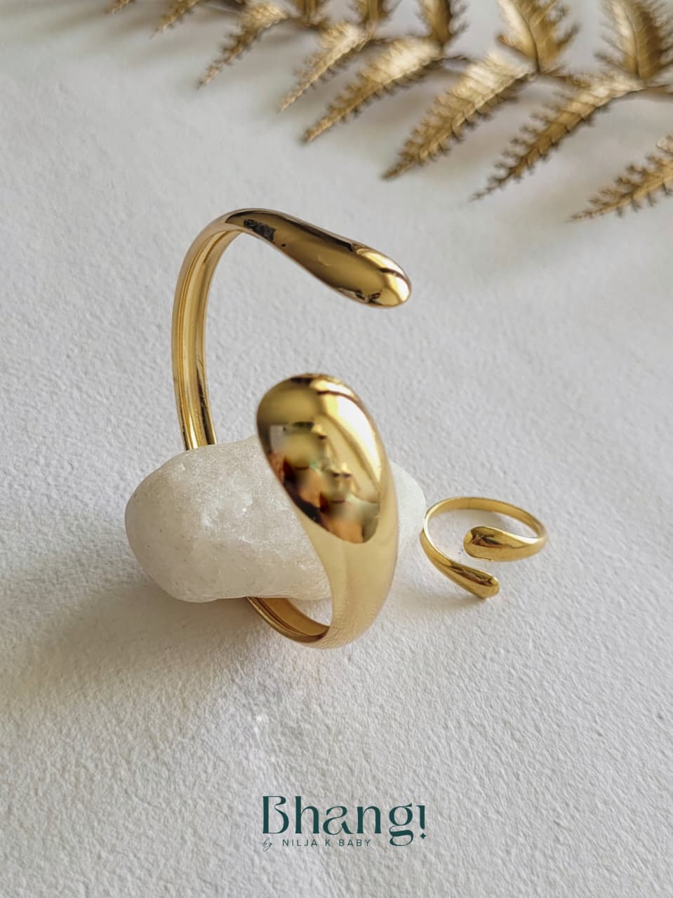 The Liquid Grace Set by Bhangi flows with elegance and modern minimalism. Featuring a smooth, fluid silhouette inspired by molten metal, this polished gold ring and bangle pair embody effortless sophistication. Their sleek organic curves reflect light beautifully — perfect for the woman who loves understated luxury with a bold edge.