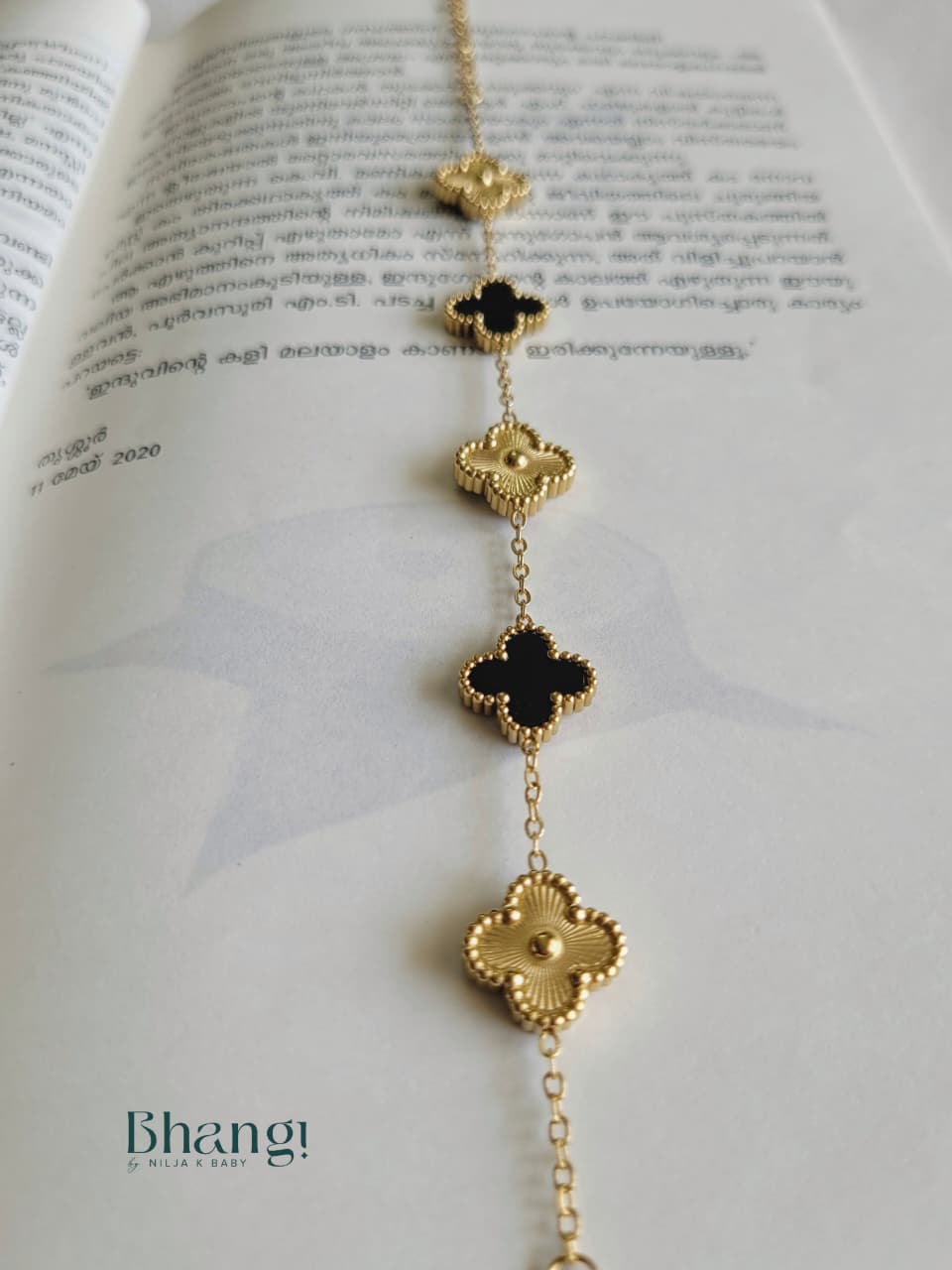 A graceful play of contrast and texture, the Noir Bloom Charm Bracelet features alternating floral motifs in glossy black and radiant gold. Each clover-inspired charm is delicately detailed, creating a timeless rhythm along a fine gold-toned chain. Elegant yet modern, this bracelet adds a refined statement to everyday looks and pairs beautifully with both ethnic and contemporary outfits. Crafted with an anti-tarnish, skin-safe finish for lasting shine and comfort.