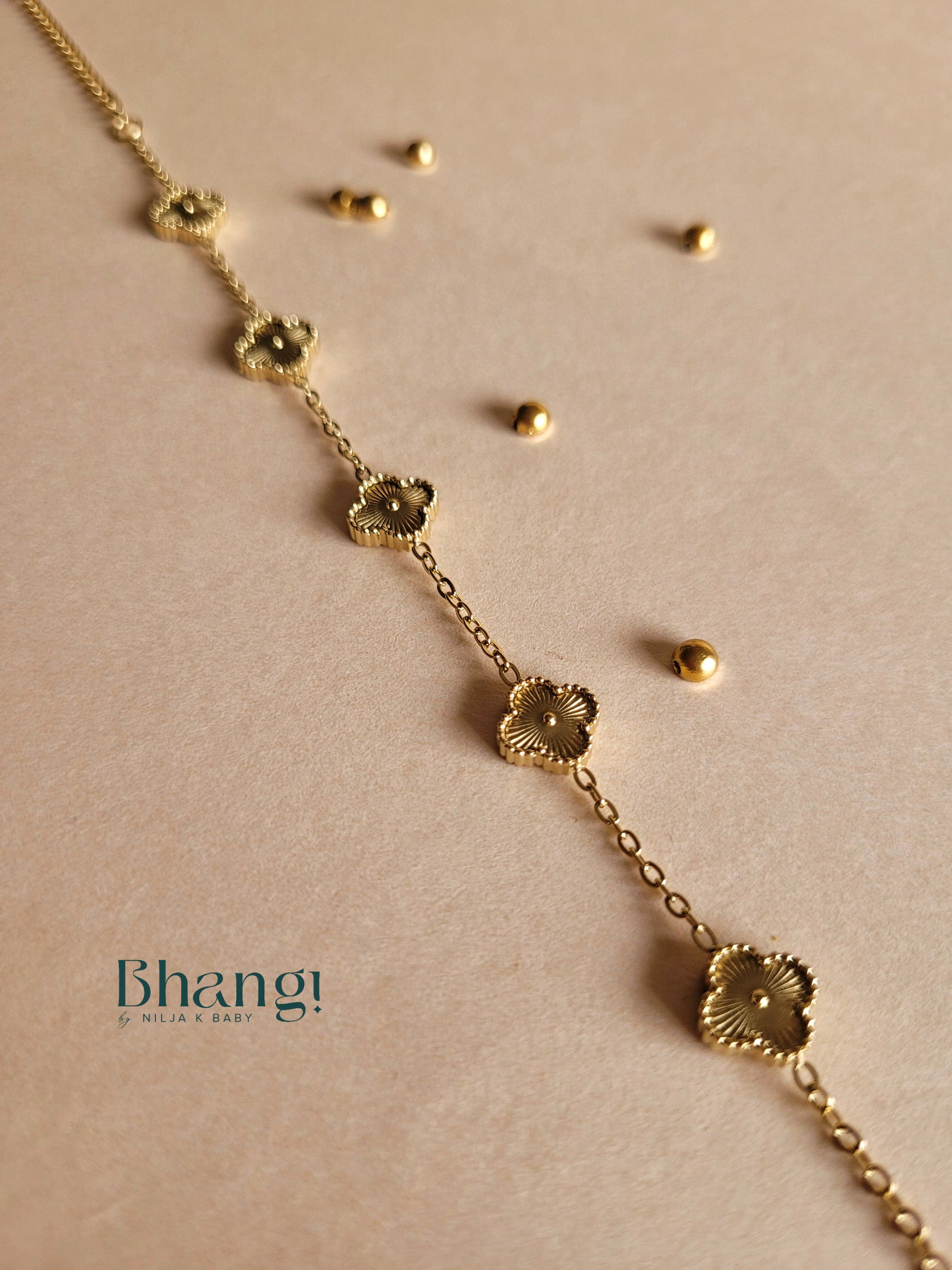 Embrace elegance with this captivating Gold Clover Charm Bracelet from Bhang! The delicate chain is adorned with four-leaf clover charms, each meticulously crafted with intricate details. This charming bracelet is sure to bring a touch of good luck and sophistication to your look.