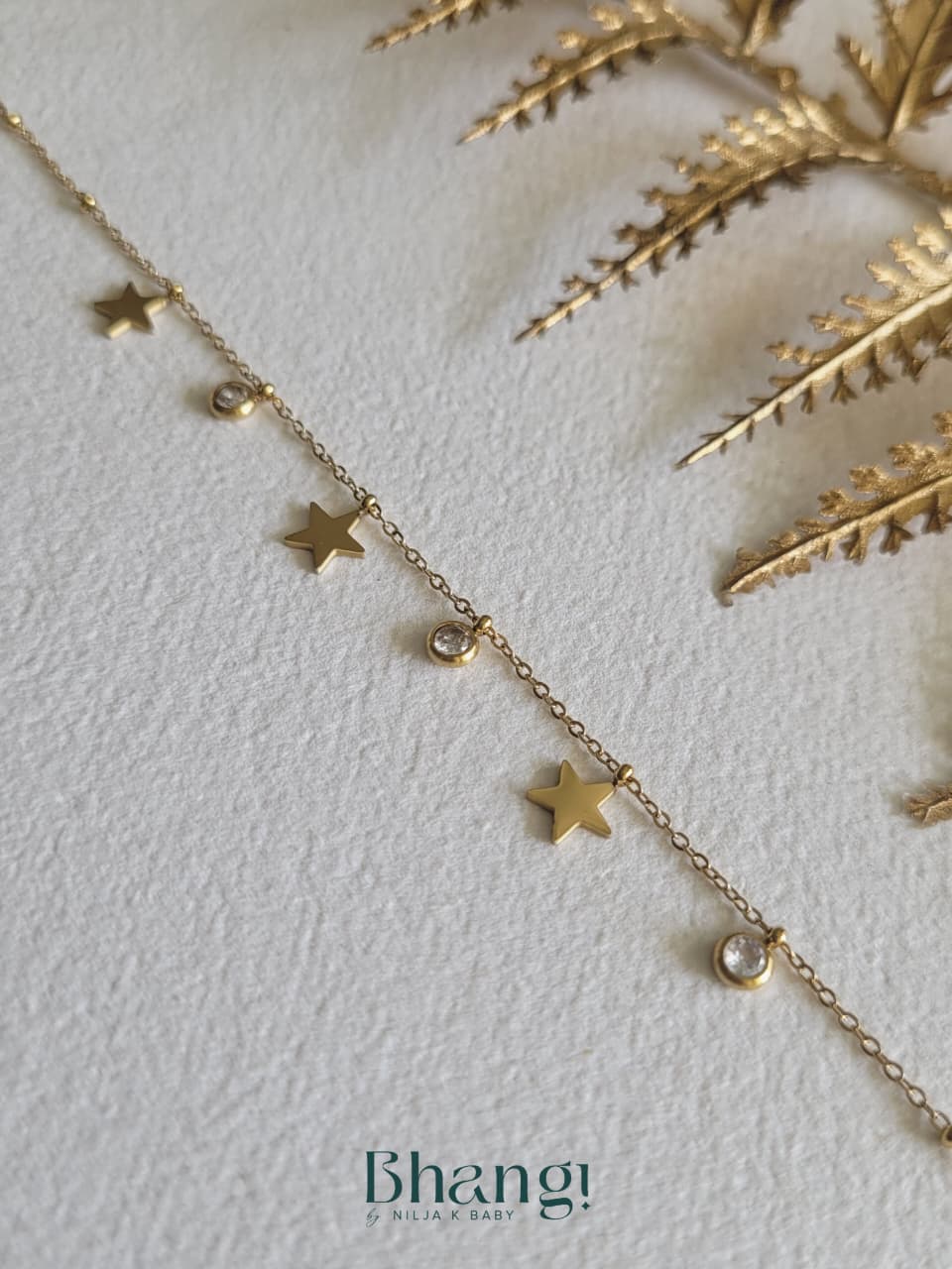 The Starlit Charm Bracelet by Bhangi captures the dreamy glow of a clear night sky. Adorned with dainty golden stars and crystal charms, this bracelet adds just the right amount of sparkle to your everyday style. Its minimal yet whimsical design makes it a perfect layering piece or a delicate standalone statement.