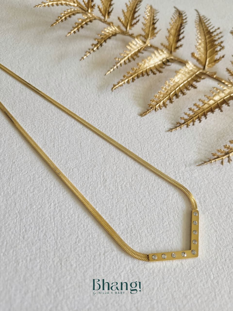 The Lustre Bar Necklace redefines modern elegance with its sleek V-shaped design, highlighted by a row of sparkling crystals. Crafted in a refined gold-tone with an anti-tarnish finish, it’s the perfect statement piece that balances boldness with minimal sophistication.