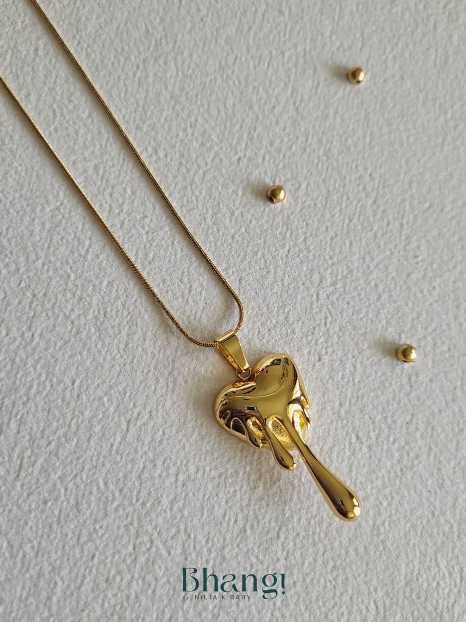 Bold, modern, and artistic — the Melted Heart Necklace is a statement of raw emotion and fluid design. The glossy golden heart pendant appears to melt gracefully into a liquid flow, symbolizing passion and vulnerability. Suspended on a sleek snake chain with a premium anti-tarnish finish, this piece is perfect for those who love jewellery that sparks conversations and expresses individuality.