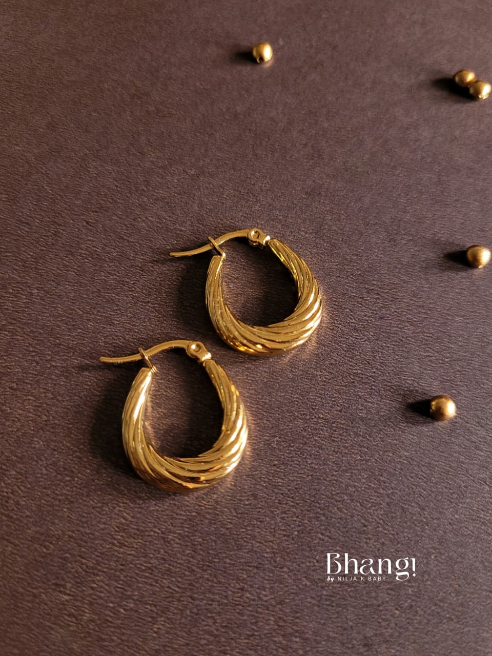 The Twirl Hoop Earrings by Bhangi feature a sculpted, wave-like texture that brings a refined twist to classic hoops. Crafted in high-shine gold plating, these earrings balance elegance and boldness — perfect for elevating your everyday or evening look. Their smooth, curved silhouette makes them a timeless addition to any jewellery collection.