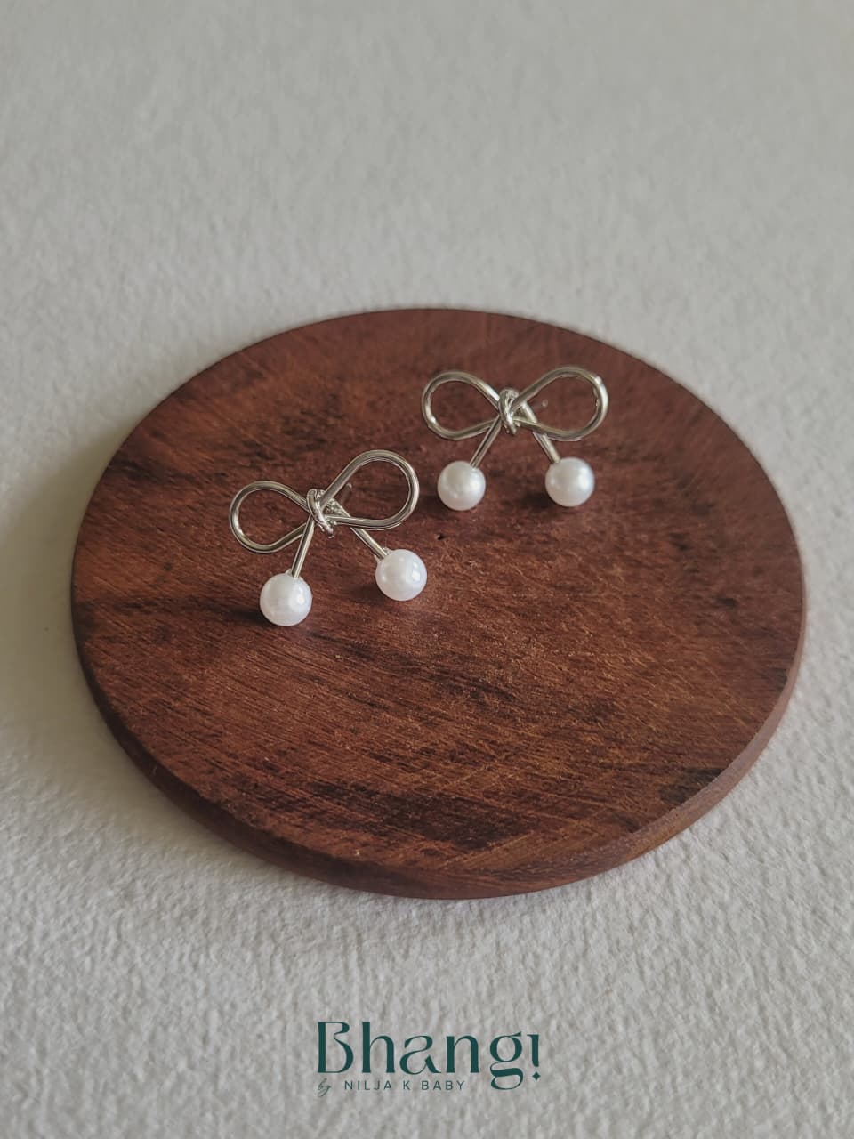 Charming and feminine, the Silver Bow Pearl Studs blend playful design with timeless elegance. The delicate silver bow is paired with dainty pearls that add a soft, graceful touch — perfect for everyday wear or a polished finishing detail for special occasions.