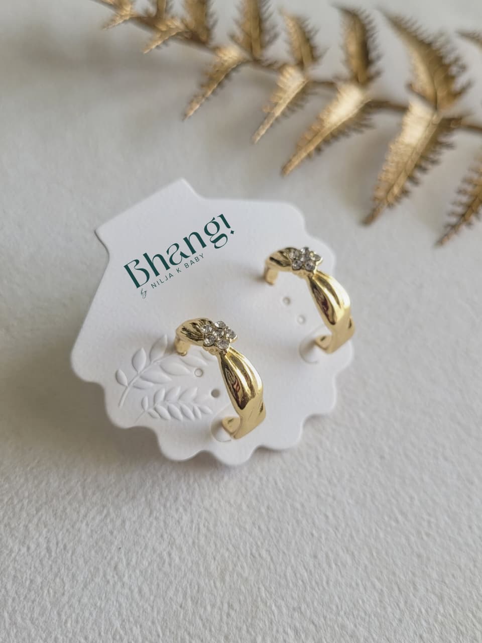 A graceful blend of softness and shine, the Aurelia Bloom Hoops feature fluid gold-tone curves gently embracing a delicate cluster of sparkling stones. The sculpted silhouette adds a modern touch, while the floral sparkle at the center brings timeless elegance. Lightweight yet striking, these earrings are perfect for elevating everyday looks or adding a refined glow to evening wear. Subtle, feminine, and endlessly wearable.