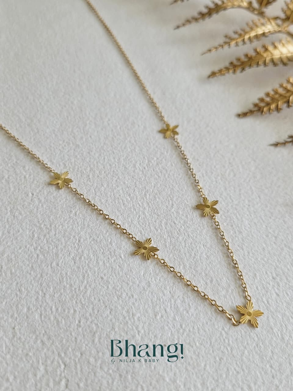 Fresh, delicate, and full of gentle charm, the Golden Daisy Chain Necklace features tiny floral motifs spaced along a fine gold-toned chain. Each petite flower adds a soft, playful detail, creating a light and graceful look that sits beautifully on the neckline.