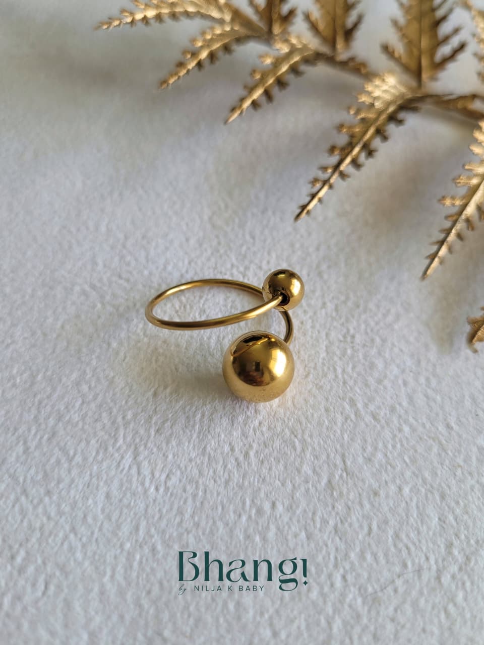 The Golden Orbit Ring is a modern minimalist statement with a playful twist. Featuring two polished gold spheres balanced on a sleek open band, this ring symbolizes harmony and movement. Its smooth, sculptural form adds a bold yet effortless charm—perfect for everyday wear or stacking with your favourites. Crafted in a premium antitarnish finish, it’s lightweight, skin-safe, and designed to shine through every moment.
